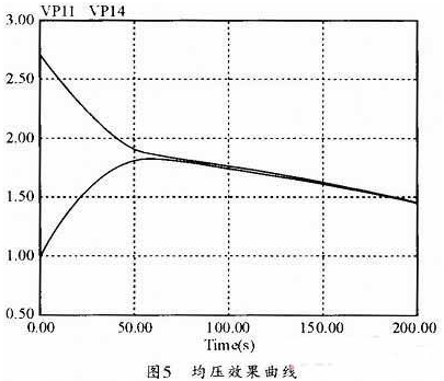 C1、C2初始電壓為2.7V,C3、C4為1V,仿真70s的時候基本均壓結束,電壓均衡到1.81V,由于電容并聯二極管的影響,電壓均衡點并沒有在算數平均值1.85V,并且升壓斬波器也消耗一部分能量。70s之后兩電容電壓基本保持同步變化。