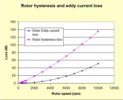 銅損是電機整體損耗中關鍵的部分,MotorSolve先進的損耗計算能力能計算出基于元件級的磁滯和渦流損耗。上圖表明轉子的磁滯和渦流損耗是轉速的函數(或等價的是頻率的函數)。渦流趨勢呈現拋物線型,而磁滯損耗與功率曲線規律相似。