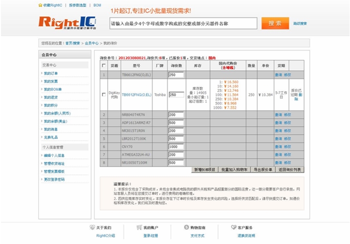 圖1:RightIC網(wǎng)站BOM單批量查詢功能的詢價(jià)頁(yè)面。