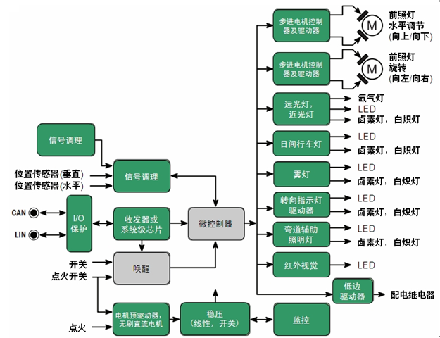 圖1:安森美半導(dǎo)體汽車(chē)前照燈方案(見(jiàn)深綠色背景框)