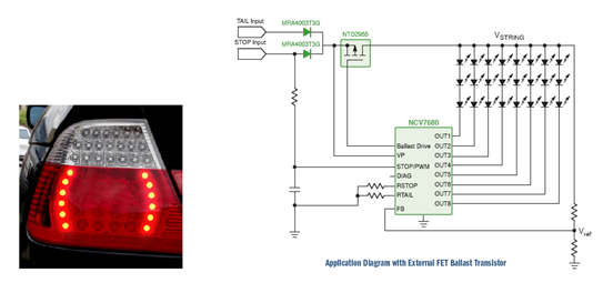 NCV7680可以作為一個(gè)獨(dú)立器件,也可以作為配合復(fù)雜系統(tǒng)的額外支持電路。結(jié)合升壓控制器運(yùn)行時(shí),額外LED可連接為一個(gè)LED串。其典型應(yīng)用包括組合尾燈、日間行車(chē)燈(DRL)、霧燈、中央高位剎車(chē)燈(CHMSL)陣列、轉(zhuǎn)向指示燈和其他外部調(diào)制應(yīng)用、液晶顯示器(LCD)背光等。