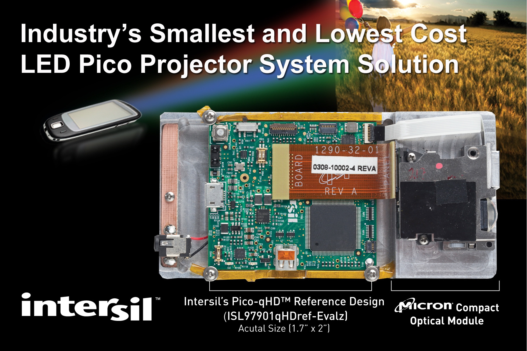 全球高性能模擬混合信號半導體設計和制造領導廠商Intersil公司日前天宣布,推出全球最低成本微型投影儀系統(tǒng)Pico-qHD™,以及已達到生產(chǎn)就緒階段的業(yè)內(nèi)最小的基于LED的LCoS微型投影儀解決方案。