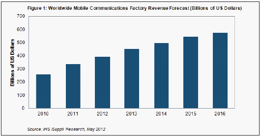 上述預(yù)測(cè)數(shù)據(jù)由無(wú)線通信產(chǎn)業(yè)各領(lǐng)域中的OEM廠商的總體工廠營(yíng)業(yè)收入構(gòu)成,包括手機(jī)、媒體平板和移動(dòng)基礎(chǔ)設(shè)備等主要領(lǐng)域,以及無(wú)線路由器、無(wú)繩電話、電池充電器和灰市手機(jī)等輔助領(lǐng)域。