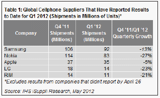 據(jù)IHS iSuppli公司的DRAM市場(chǎng)簡(jiǎn)報(bào),爾必達(dá)第一季度營(yíng)業(yè)收入比2011年第四季度增長(zhǎng)1%,占據(jù)大約12.6%的市場(chǎng)份額,排名升至第三。雖然其增長(zhǎng)幅度可能顯得很小,但爾必達(dá)的表現(xiàn)優(yōu)于整體DRAM市場(chǎng)。第一季度整體DRAM市場(chǎng)的營(yíng)業(yè)收入為62億美元,比2011年第四季度的65億美元下降4%,如表1所示。爾必達(dá)的表現(xiàn)也優(yōu)于緊隨其后的美光。美光的第一季度營(yíng)業(yè)收入環(huán)比下降3%,排名下降一位至第四。