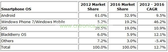 下表反映了IDC對2012年和2016年全球智能手機(jī)操作系統(tǒng)所占市場份額以及2012到2016年之間復(fù)合年增長率的預(yù)期: