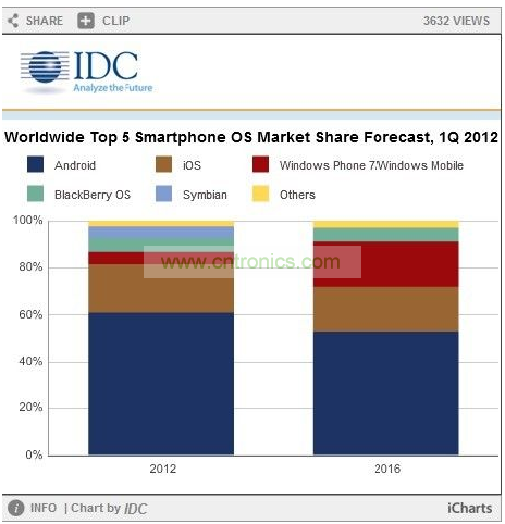 與此同時,iOS則將延續(xù)其令人印象深刻的表現(xiàn),主要由于iPhone 4S今年在北美、西歐和亞太(尤其是中國)市場上仍將保持強勁的增長動量。IDC預(yù)測,在未來五年時間里,iOS的增長速度將是有節(jié)制的,原因是蘋果已經(jīng)積累了龐大的用戶基數(shù),這意味著其更多的可尋址