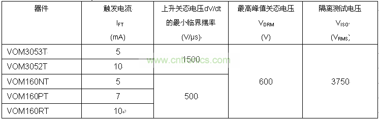 VOM3052T和VOM3053T具有高達1500V/μs的靜態dV/dt,尤其適用于噪聲環境。在這些地方,即使在輸入端沒有任何觸發信號,由于在輸出負載上存在高擺率瞬態,較低的dV/dt可能引起晶閘管觸發。