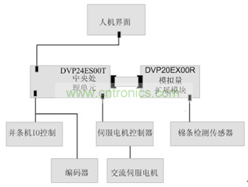 該控制系統(tǒng)的中央處理單元使用臺達(dá)DVP E系列的PLC,伺服控制系統(tǒng)使用臺達(dá)ASDA系列產(chǎn)品,人機(jī)界面使用選配DOP-B系列觸摸屏。工作時,PLC通過DVP20EX00R模擬量控制模塊讀取棉條檢測傳感器的棉條厚度,對編碼器信號的處理計算出勻整1羅拉的速度,依據(jù)勻整控制關(guān)系式,就可計算出勻整2羅拉的轉(zhuǎn)速,再通過伺服控制器控制伺服電機(jī),以達(dá)到對勻整2羅拉的控制。