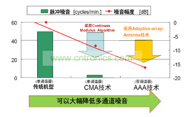 圖2將CMA及AAA技術的多通道噪聲消除性能與傳統技術單調諧器進行了比較。左邊縱軸是每分鐘脈沖噪聲的發生次數,右邊縱軸是噪聲強度,很明顯,安森美半導體的單調諧器技術可以大幅降低多通道噪聲,且雙調諧器AAA技術幾乎可以完全消除多通道噪聲。