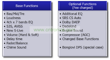 左邊表中是一些基本功能,其中S3S、AViSS、New S-Live是安森美半導體自己的算法,可免費提供給客戶;右邊是可供選擇的算法,需要使用授權,或更改時需要研發費用,其中包括業界知名的SRS CS Auto及Dolby DAEP算法,而Bongiovi DPS是最先進的音效處理技術。安森美半導體目前是該技術唯一的IC合作伙伴。