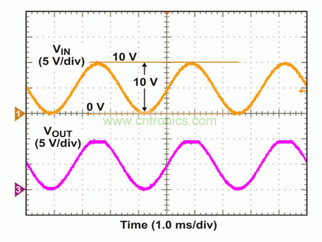 為了測試該電路,我們將VCC/2 = 5V DC偏移的300 Hz正弦波應用于輸入端。在VOUT出現變化以前,一直對AC幅值進行調節。如圖4所示,當應用10 Vp-p輸入時,VOUT在正軌附近出現一個經削波的信號,而非負軌附近。如果輸入超出VCC – 0.8V(本例中為9.2V),這種正軌附近出現的非理想行為是我們能夠預計到的。9.2V以下VIN電平和低至0V時,VOUT顯示出正確的波形,正如我們所預期的那樣。