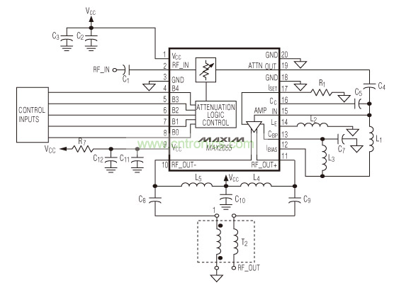 Maxim的MAX2055、MAX2027可用作MAX12559的緩沖放大器,MAX2055是一個帶寬在30~300MHz的數控可變增益放大器(圖2)。