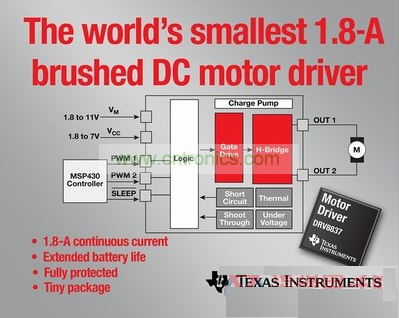 日前,德州儀器 (TI) 宣布推出業界最小型 1.8 A 有刷 DC 電機驅動器,進一步壯大其不斷發展的低電壓 DRV8x 電機驅動器產品陣營。該 DRV8837 與最接近的同類競爭產品相比外形縮小 75%,可實現更小巧、更時尚、更具創新性的系統設計。此外,與現有器件相比,它還將 RDS(ON) 降低 50%,將睡眠電流降低 75%,從而延長電池使用壽命,提高電池供電或低電壓運動控制應用的散熱性能。