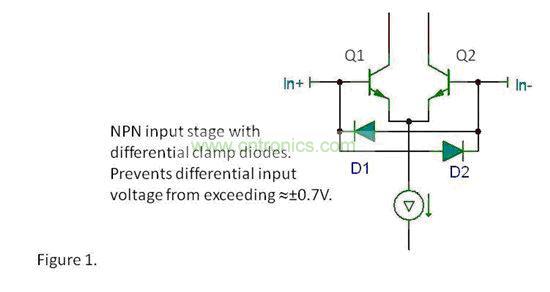 許多運算放大器都在輸入端之間有電壓鉗位,其大多數一般都使用背靠背二極管(有時使用兩個或者更多的串聯二極管)來實施。這些二極管保護輸入晶體管免受其基極結點反向擊穿的損害。差動輸入為約6V 時便會出現許多IC 工藝擊穿,這會極大地改變或者損壞晶體管。下圖顯示了NPN 輸入級,D1 和D2 提供了這種保護功能。
