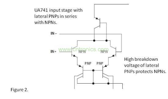 一般而言,雙極NPN 晶體管運算放大器都有輸入鉗位,例如:OP07、OPA227 和OPA277 等。uA741 是一個例外,它具有NPN 輸入晶體管,并且有一些為NPN 提供固有保護的附加串聯橫向PNP。