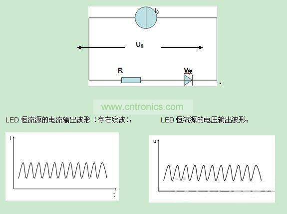 假設LED驅動此時輸出的電流值I0為100mA,R=10Ω,二極管導通電壓Vd=30V,那么實際的LED燈拉載時,LED驅動的輸出電壓U0=100mA*10Ω+30V=31V,輸出為31V/100mA。假設恒流源的輸出電流紋波為10mA, LED驅動的輸出電壓紋波實為10mA*10Ω=0.1V。