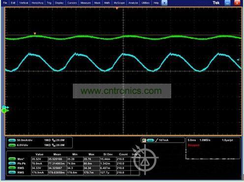 下圖為艾德克斯IT8800模擬LED燈測試LED恒流源時的波形圖: