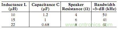 常見的濾波器設計選擇目的是為了在所需要的最高音頻頻率條件下將濾波器響應下降減至最小以獲得最低帶寬。如果對于高達20 kHz頻率,要求下降小于1 dB,則要求典型的濾波器具有40 kHz巴特沃斯(Butterworth)響應(以達到最大平坦通帶)。對于常見的揚聲器阻抗以及標準的L值和C值,下表給出了標稱元器件值及其相應的近似Butterworth響應: