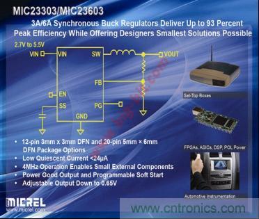 麥瑞半導(dǎo)體推出了采用HyperLight(R)Load技術(shù)的4MHz PWM 6A/3A同步降壓穩(wěn)壓器系列產(chǎn)品MIC23603/303。MIC23603/303采用的專利架構(gòu)提供了最高水準(zhǔn)的瞬態(tài)性能,在全脈寬調(diào)制(PWM)模式下輸出紋波僅有5mV。MIC23603/303將低損耗的專利功率MOSFET與麥瑞半導(dǎo)體擁有專利的恒定導(dǎo)通時間直流-直流開關(guān)轉(zhuǎn)換器方案結(jié)合在一起,可提供高達(dá)6A/3A的輸出電流,同時僅消耗24μA靜態(tài)電流。MIC23603/303是驅(qū)動機頂盒、便攜式設(shè)備以及汽車儀表中的FPGA、ASIC和DSP集成電路的理想產(chǎn)品,在這些應(yīng)用中,超快瞬態(tài)響應(yīng)和輕載效率至關(guān)重要。MIC23603目前已經(jīng)開始批量供應(yīng),千片訂量的價格為1.08美元/片。MIC23603的千片訂量價格為0.49美元/片。