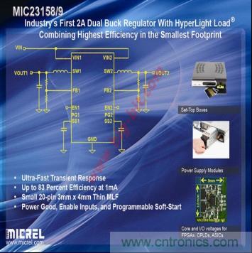 麥瑞半導(dǎo)體推出了兩款3MHz雙輸出2A高效降壓穩(wěn)壓器MIC23158/9。得益于麥瑞半導(dǎo)體擁有專利的HyperLight Load®技術(shù),這兩款集成電路為當(dāng)今最苛刻的應(yīng)用提供了超快的瞬態(tài)響應(yīng),包括機頂盒、針對FPGA的核心和I/O電壓、CPLD、ASIC、GPS/導(dǎo)航系統(tǒng)、PC卡、汽車儀表以及通用負(fù)載點(POL)直流-直流轉(zhuǎn)換等應(yīng)用。MIC23158/9目前已經(jīng)開始批量供應(yīng),千片訂量的價格分別為0.88美元/片和0.91美元/片。