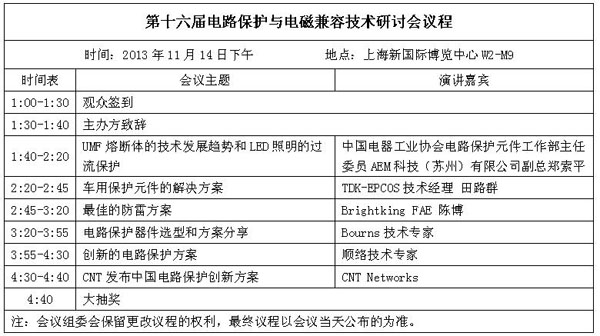 本屆研討會內容豐富,貼近電子工程師的實際研發工作。研討會中,AEM科技副總鄭索平將詳細介紹UMF熔斷體的技術發展趨勢和LED照明的過流保護解決方案; TDK-EPCOS的技術經理田路群將分享針對電源盒通訊的電路保護解決方案;Bourns公司的專家也將詳解電路保護器件的選型和應用設計方案;君耀電子的資深工程師陳博還會詳細講解如何設計最佳防雷方案,順絡電子將分享創新的電路保護解決方案。此外,電子元件技術網,也將在論壇中與觀眾分享最受網友關注的“中國電路保護創新方案”。