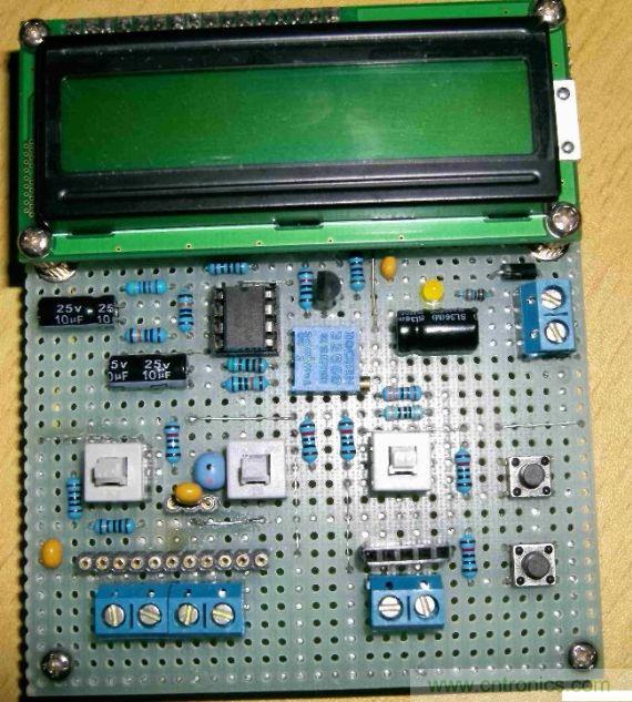 上圖中,Btn1是單片機(jī)復(fù)位按鈕;Btn2是校準(zhǔn)按鈕,在測量小電容時(shí)候可以隨時(shí)按下清零顯示;Btn3是功能切換按鈕,用來在測量LCF(頻率、小電容、電感)和測量電解電容之間切換。