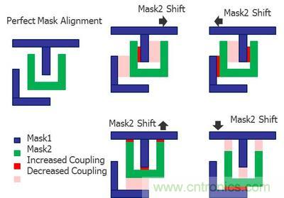 圖2:雙重成像(DP)的光罩可能存在的未對準情況要求設計人員評估更多寄生參數(shù)提取的corners,以驗證集成電路的時間選擇和性能。