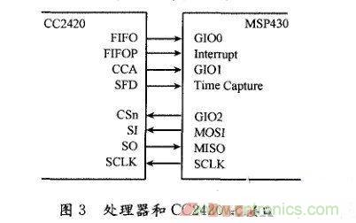 主 控節點結構如圖2所示。它通過串口與PC主機交互數據,通過無線模塊與艙內子節點通信,同時管理和協調艙內各節點的工作時序和同步。其中,微處理器用TI 公司超低功耗的MSP430F149,無線通信模塊選用Chipcon公司的2.4GHz頻段射頻低功耗接口芯片CC2420,電源模塊采用DC/DC電 源變換模式。MSP430微控制器在16bitRISC核的基礎上集成了RAM和閃存,同時集成了8路A/D轉換模塊、傳輸速度可編程的串口模塊和一個靈 活的時鐘子系統,支持多種低功耗操作模式。CC2420芯片與IEEE802.15.4協議兼容,最大數據數率250Kbit/s,可編程控制輸出功率, 并支持錯誤校正和加密。MSP430可通過SPI接口和中斷數字I/O線對CC2420進行控制,如圖3所示。