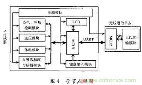 傳 感器子節點的組成框圖如圖4所示,包含電源模塊、心電與呼吸監測模塊、血壓監測模塊、血氧飽和度與脈搏監測模塊、體溫監測模塊、無線傳輸節點、微處理器模 塊、輸入與LCD顯示模塊等8個子模塊,主要執行生命體征參數的采集、放大、濾波和無線傳輸,無線傳輸前,子節點也進行實時分析、特征提取等信號預處理。
