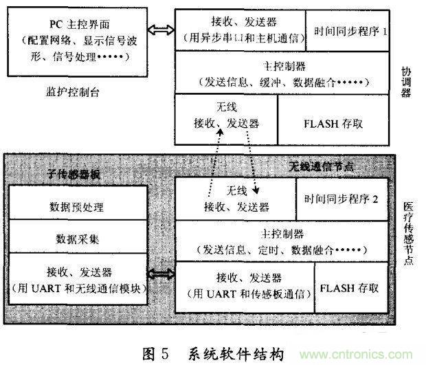 基于Zigbee星型網絡無線通信協議IEEE802.15.4,可穿戴式醫療監護設備的軟件系統主要具備控制程序、通信軟件和用戶界面等三大功能,具體分布在PC控制主機程序、網絡協調器軟件和傳感子節點軟件中,如圖5所示。
