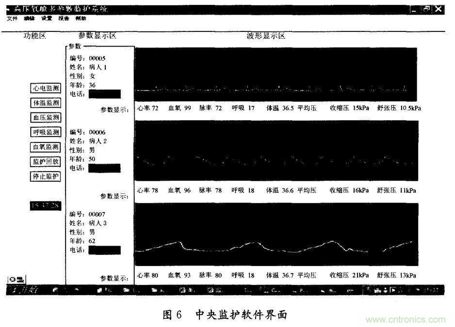 中央監護界面通過中央監護界面可實現主節點對WSN的參數配置、接收主節點傳來的采集數據、利用主機的處理能力對數據進行存儲、處理、識別、評估和報警等。本監護設備的中央監護界面采用VB開發實現,如圖6所示。
