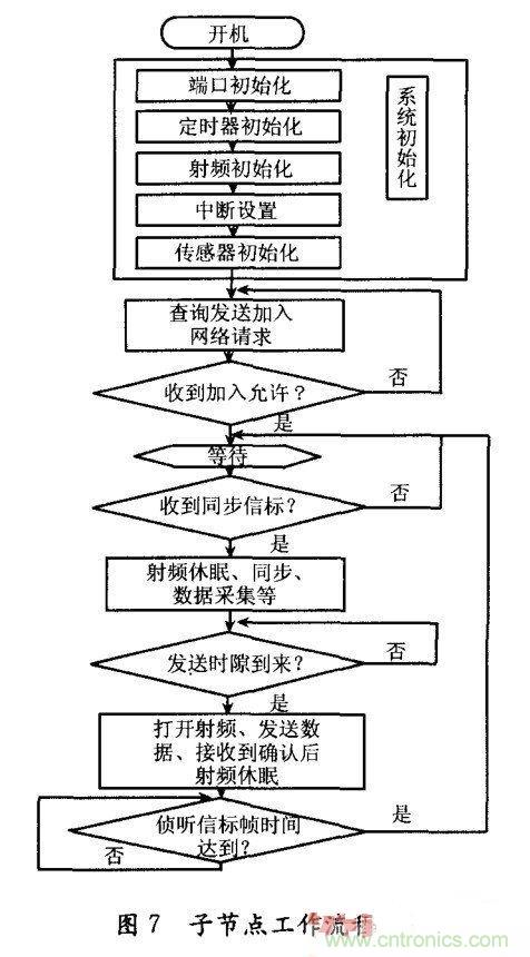 傳 感節點軟件和傳感器協調器軟件的程序流程分別如圖7和圖8所示。本流程在IEEE802.15.4協議基礎上,結合TDMA技術和無線傳感器網絡S- MAC協議思想而設計。從圖7可以看出,為了節省傳感節點的能耗,除加人網絡請求、發送數據和偵聽同步信標幀時段外,傳感節點均處于休眠狀態。