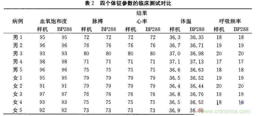 本 可穿戴生命體征監護設備樣機已研制完成。采用本樣機對高壓氧艙中的10例病例(男5例,女5例,年齡22~71歲,平均年齡46.2歲)在2.0ATA艙 壓下進行臨床測試(終端機與主機距離為10米),并與日本COLINBP288監護儀檢測結果進行對照。表2顯示的血氧飽和度、脈搏、心率、體溫、呼吸頻 率等參數的對比檢測數據的一致很好。