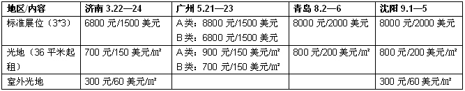 備注:標準展位:包括(3M×3M)展位(三面圍板、楣板、一桌二椅、220V電源插座、照明費、清潔費等)