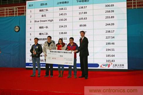 本次大賽評審委員會由大聯大、白金級贊助商恩智浦(NXP)和行業內專家共同組成,經過對所有參賽飛行器軟硬件架構、外觀設計、現場飛行平穩度和精準度等方面的綜合考量,來自南京航空航天大學南航二隊參賽隊的四軸飛行器凌空號作品表現優異,以306.69的總分最終獲得了本屆大賽的總冠軍。北京科技大學的金戈參賽隊和鄭州航空工業管理學院的Blue Dream High參賽隊分別獲得了亞軍和季軍。