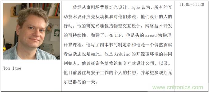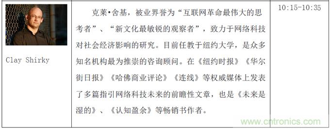 本次創客論壇三天共三個主題:啟蒙創新、創客本質和協同合作,將邀請到包括暢銷書《失控》作者Kevin Kelly、克萊舍基、Arduino開源電子原型開發平臺聯合創始人Massimo Banzi、第一個生物創客空間BioCurious聯合創始人Tito Jankonski、F.laobo的制作人和ArduinoFio的設計者Shigeru Kobayashi、Intel最小的實習生Joey Hudy和為麻省理工研究生授課的14歲電子神童QuinEtnyre等等共50余位來自全世界各地的創新領域領軍人物。
