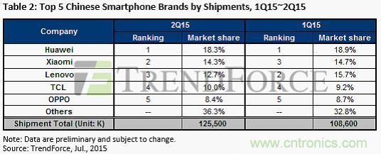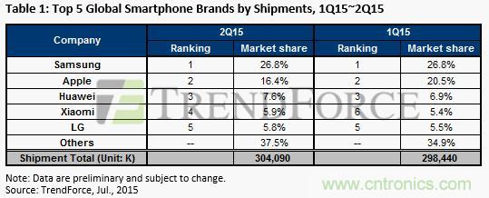【導讀】近日,市場研究機構TrendForce發布2015年度第二季度全球智能手機報告。中國的華為明顯獨領風騷。數據顯示,三星雖然從蘋果手里奪回第一的寶座,但是,Q1和Q2 幾乎毫無變化。蘋果的市場份額則一調再掉,從Q1的20.5%掉到Q2的15.4%。華為的市場份額增加了7%,小米的份額增加了5%。