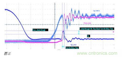 測試的目的是看上MOS管導通時,有沒有同時把下管打開,從而導致電源直接導通到地而引起短路。如圖三所示藍色曲線(Vgs_Lmos)就是下管在上管導通的同時,被帶了起來,如果藍色曲線的被帶起來的尖峰超過了MOS管的Vth要求,同時持續時間(Duration)也超過了datasheet要求,從而就會有同時導通的風險。當然,這是大家最常見到的情況。