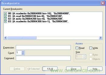 具體定義方法:在Expression內(nèi)輸入變量的地址,然后選擇讀寫屬性,并正確設(shè)置字節(jié)范圍,最后點擊Define即可。例如,在地址0x20004000開始,16字節(jié)范圍內(nèi),定義讀寫斷點操作,具體設(shè)置方法如圖4所示。