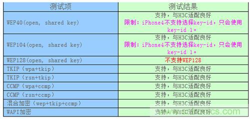 從測試結果可以看出:除了WEP128,iPhone 4對各種加密方式均能很好的支持,在采用混合加密的H3C WLAN網絡中也能很好的相互適配。