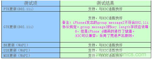 從測試結果可以看出,iPhone 4的GTK更新報文并不符合802.11i協議的規定,對group message2的key length域錯誤的進行了賦值。H3C設備由于對此采用了寬進嚴出的原則,可以很好的進行兼容。這一點也體現出手機終端兼容性測試的重要性。