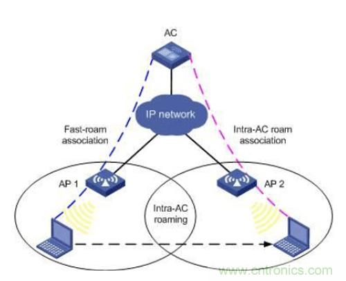 AC內漫游(Intra-AC roaming):一個無線終端從AC的一個AP漫游到同一個AC內的另一個AP中,即稱為AC內漫游。如圖1所示。