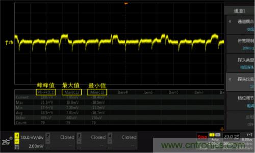 紋波測試一般以峰峰值來表示,具體可以使用【measure】進(jìn)行自動測量,如下截圖ZDS2000系列示波器,能支持51種真正意義的參數(shù)測量統(tǒng)計功能,基于全存儲深度的基礎(chǔ)上測量紋波的參數(shù),或者也可以使用“一鍵光標(biāo)”進(jìn)行手動測量,如下圖6所示。