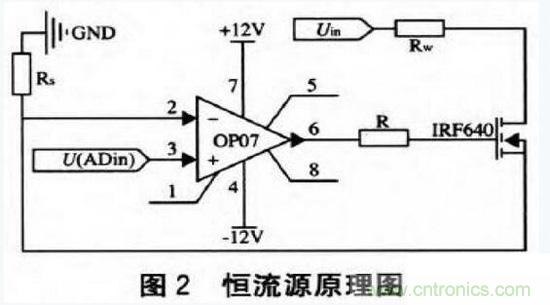 通過16位高精度模數轉換器ADSlll5輸出電壓給恒流源電壓轉換恒定電流電路,由于運算放大器OP07是精度高、低漂移運算放大器,并且在10歐負載的情況下輸出電流能達到2 A。所以采用OP07和IRF640組成的一個Uin。電流串聯負反饋來實現電壓到電流的轉換,具體電路如圖2所示。
