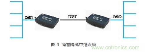 如圖4所示,將兩個CSM100的UART口交叉對接,設定工作模式為透明帶標識符傳輸,分別設置各自對接CAN網絡的通訊波特率參數。這樣CAN總線的報文數據會先轉換成串口再轉換為CAN數據,信號得到了放大和隔離。