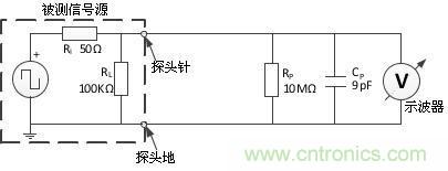 且看圖解,如圖3所示為示波器使用探頭進行信號測量理論上的等效模型。探頭與示波器組成具有一定輸入電阻和輸入電容的測試設備;被測量信號等效為具有一定內阻與工作負載的源。