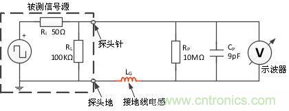 由于地線是一根導線,因此它有一定數量的分布式電感,線越長電感則越大。常規的測量方法就會由鱷魚線引入分布式感,此時它的等效模型如圖4所示的LG電感,這一電感將與探頭電容相互影響,在LG和CP值確定的某個頻點上形成諧振,導致減幅振蕩現象的產生。