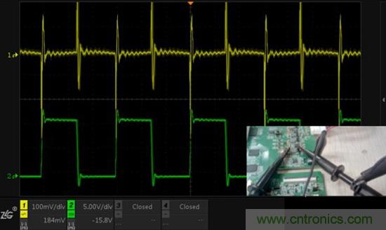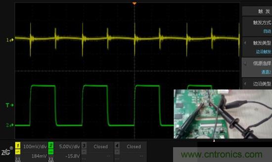 圖2.CH1使用夾子測量電源輸出,CH2懸空