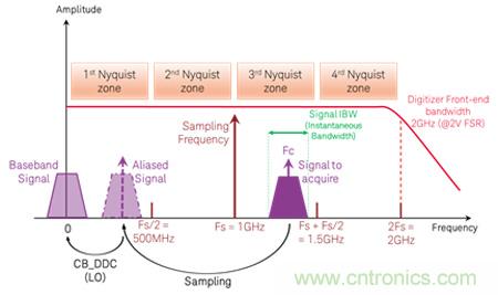 在數字化儀中,您可以考慮選擇超過采樣率(fn)一半的帶寬。有時可以通過欠采樣(undersampling)和特殊輸入濾波來捕獲大于 Fs/2 的頻率。例如,是德科技的 M9203A 和 M9703B 數字化儀支持 2 GHz 帶寬,ADC 采樣時鐘速率為 1.6 GS/s,允許使用欠采樣直接進行下變頻。