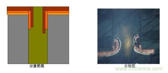 4. 塞孔無銅:圖電蝕刻后,有明顯的物質卡塞在孔中,大部分孔壁被蝕掉,斷口處圖電層未將板電層包住。